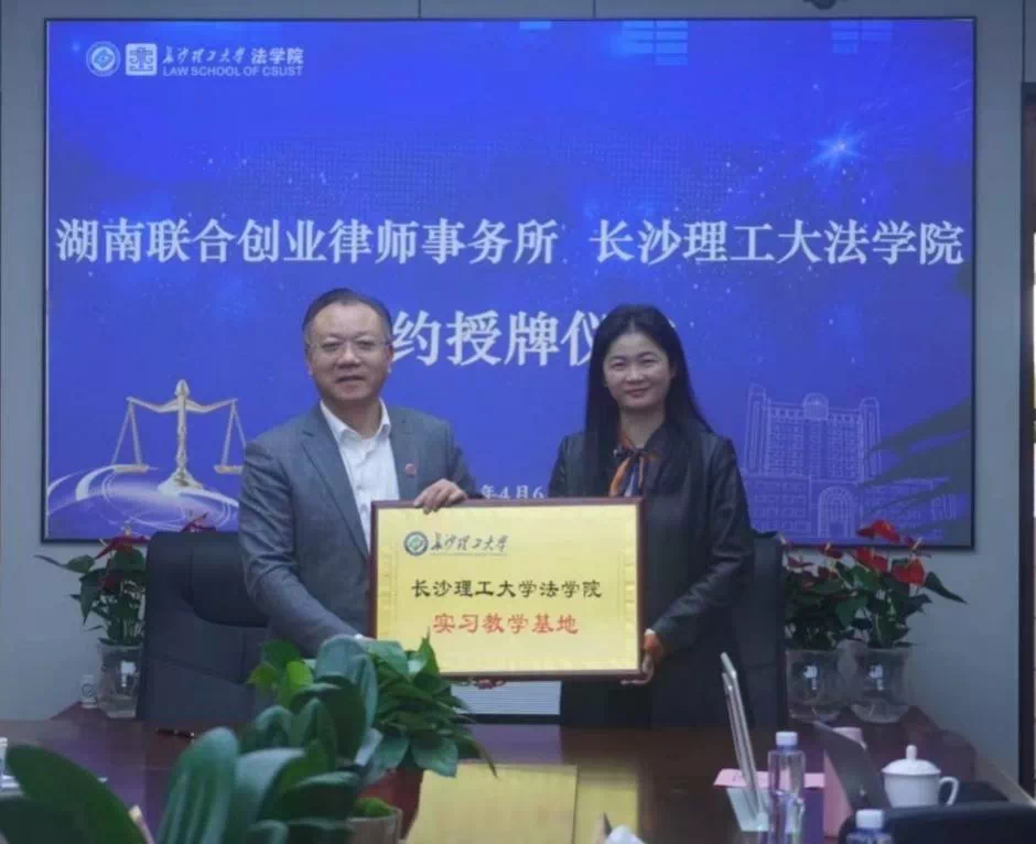 4月6日下午,长沙理工大学法学院与湖南联合创业律师事务所在四号教学楼313会议室举行实习就业基地签约授牌仪式。湖南联合创业律师事务所管委会主任胡赞兵、管委会行政总监罗湘波、管委会财务总监唐锦昌、管委会宣联主任刘研、妇委会主任梁腊梅,法学院院长张敏纯,党总支书记田兴洪,党总支副书记汪功伟,副院长申纯,副系主任王寰,学工办主任熊文娟出席仪式。仪式由书记田兴洪主持。