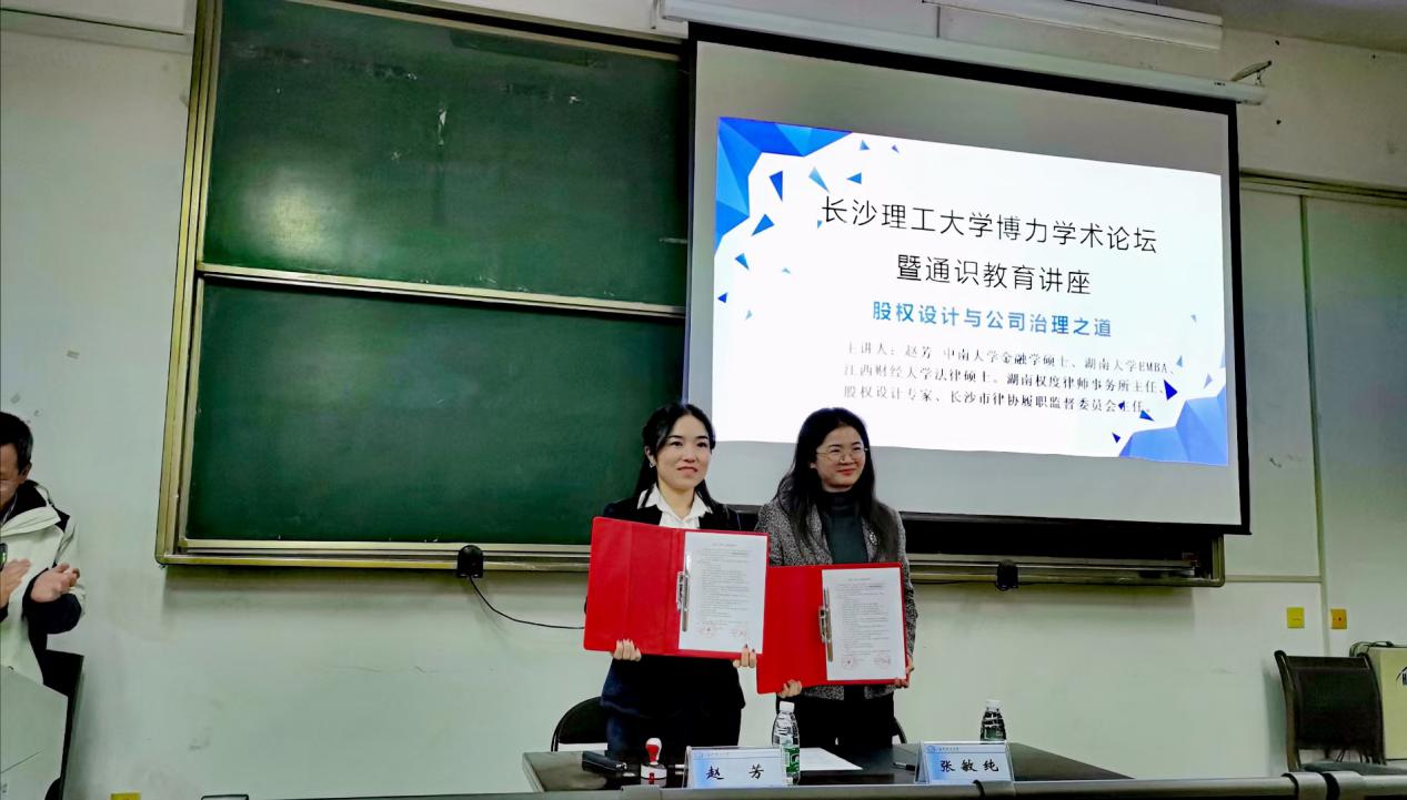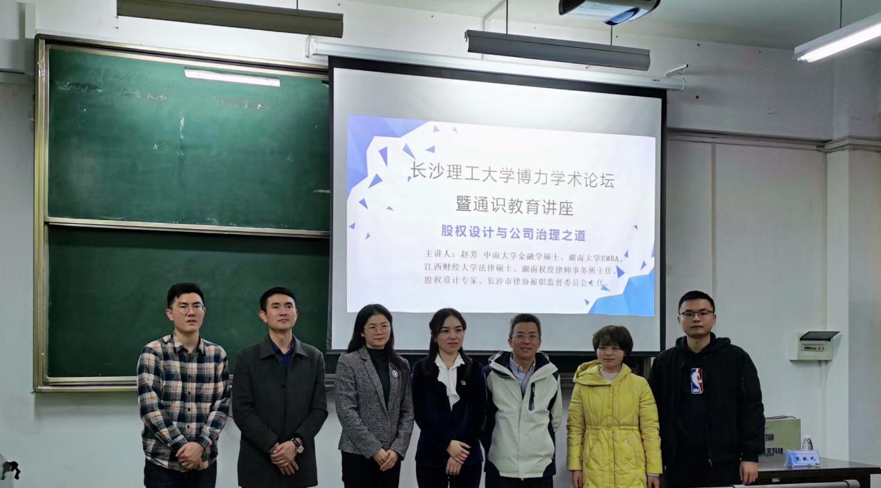 签约仪式结束后,举办了题为“股权设计与公司治理之道股权设计与公司治理之道”的学术讲座。讲座由湖南省权度律师事务合伙人,主任赵芳律师担任主讲人。本次讲座由长沙理工大学法学系教授、法学学科带头人王新生教授主持,我系教师、硕士研究生及本科生共同聆听了此次讲座。