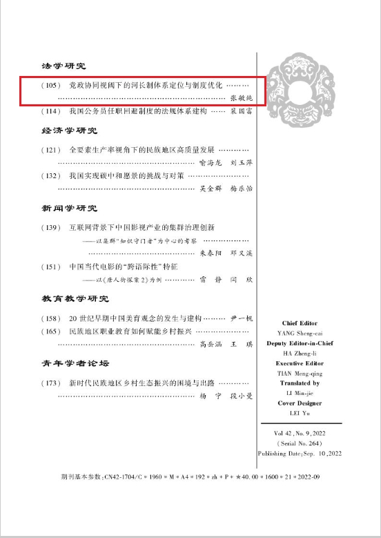 近日,长沙理工大学法学院院长张敏纯在《中南民族大学学报(人文社会科学版)》(CSSCI来源期刊)2022年第9期发表论文《党政协同视阈下的河长制体系定位与制度优化》