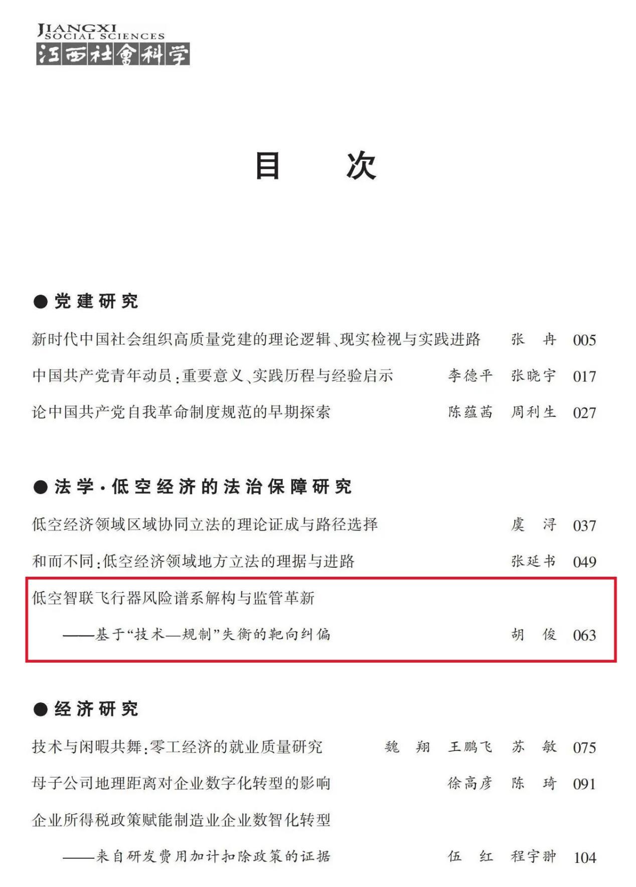 近日,长沙理工大学法学院讲师胡俊在《江西社会科学》2025年第5期发表论文《低空智联飞行器风险谱系解构与监管革新—基于“技术—规制”失衡的靶向纠偏》。