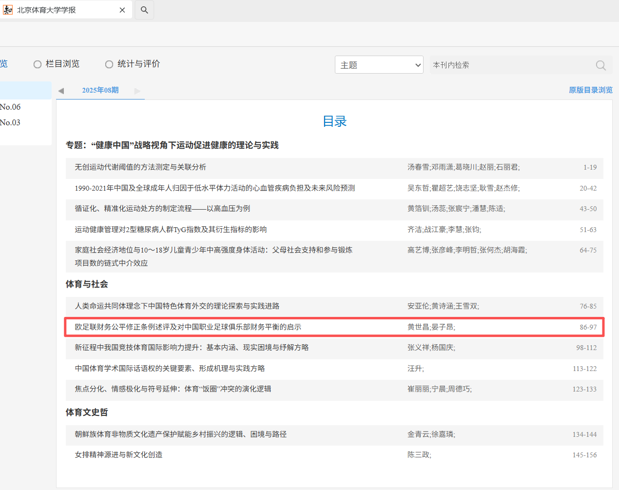 近日,长沙理工大学法学院讲师晏子昂在《北京体育大学学报》2025年第8期发表论文《欧足联财务公平修正条例述评及对中国职业足球俱乐部财务平衡的启示》。