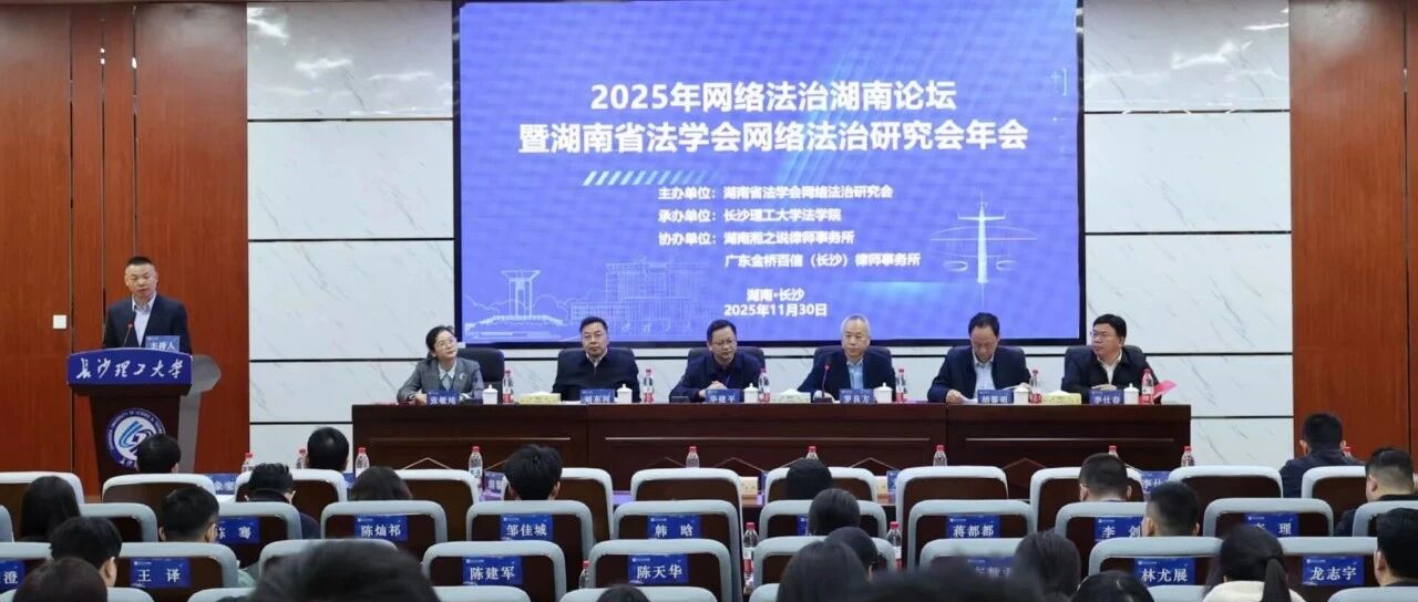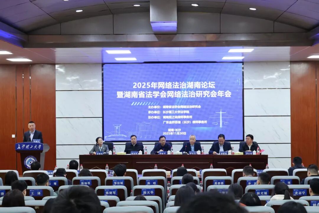 11月30日,2025年网络法治湖南论坛暨湖南省法学会网络法治研究会年会、长沙理工大学第二十一届研究生博力学术论坛“数智法治”专题论坛在长沙理工大学金盆岭校区隆重举行。本次会议由湖南省法学会网络法治研究会主办,长沙理工大学法学院承办,湖南湘之说律师事务所、广东金桥百信(长沙)律师事务所协办,来自省内外高校、科研院所、司法实务部门、律师行业,以及企业界的百余位专家学者、实务工作者与硕博士研究生齐聚一堂,围绕网络法治领域的前沿热点与实务难题展开深度研讨。