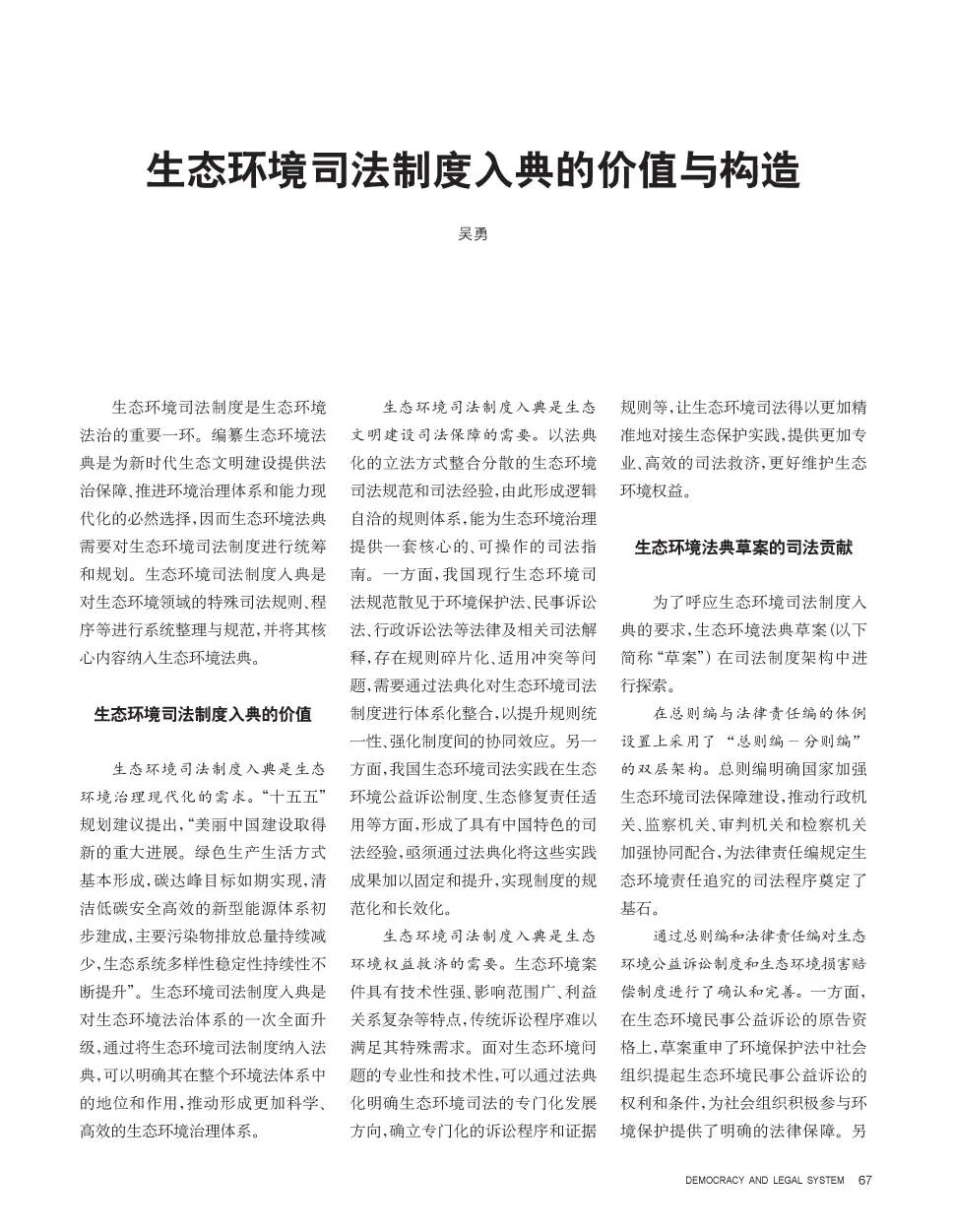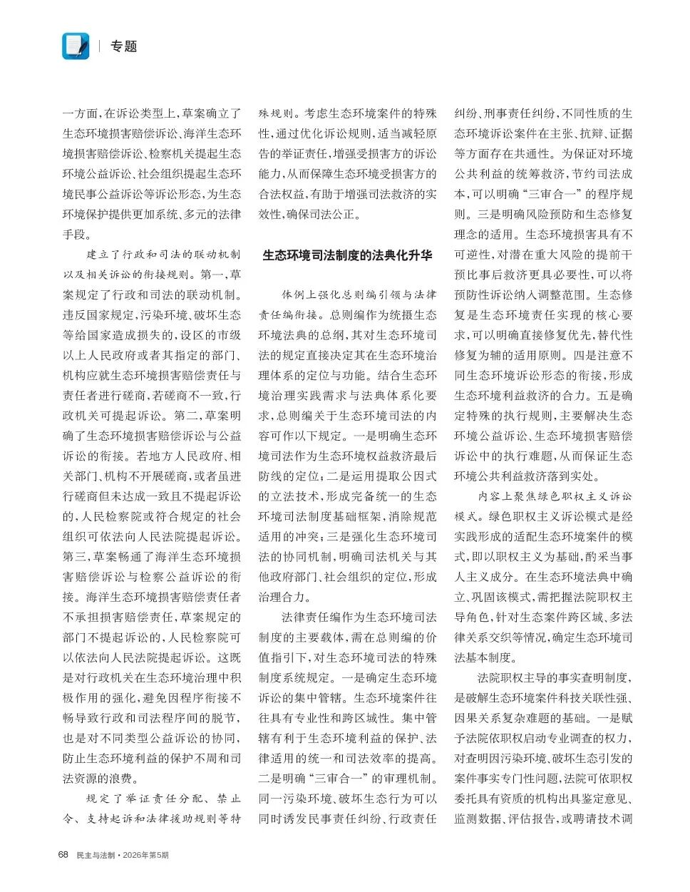近日,长沙理工大学法学院学术院长、教授吴勇在《民主与法制》2026年第5期发表《生态环境司法制度入典的价值与构造》一文。