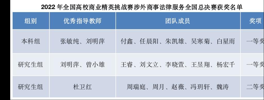 近日,2022年全国高校商业精英挑战赛国际贸易竞赛全国总决赛完美闭幕,在本次比赛中,由法学院本科生与研究生组成的三支队伍在指导老师和队员们的不懈努力下成功入围涉外商事法律服务赛道总决赛,勇夺该赛道一等奖两项,二等奖一项。此次竞赛共有来自全国132所高校的625支队伍参赛,共角出的14个一等奖中雷竞技官网荣获两项,这是雷竞技官网积极回应国家“加快建设涉外法治人才队伍”的要求,着力培养高素质涉外法律人才的集中体现。