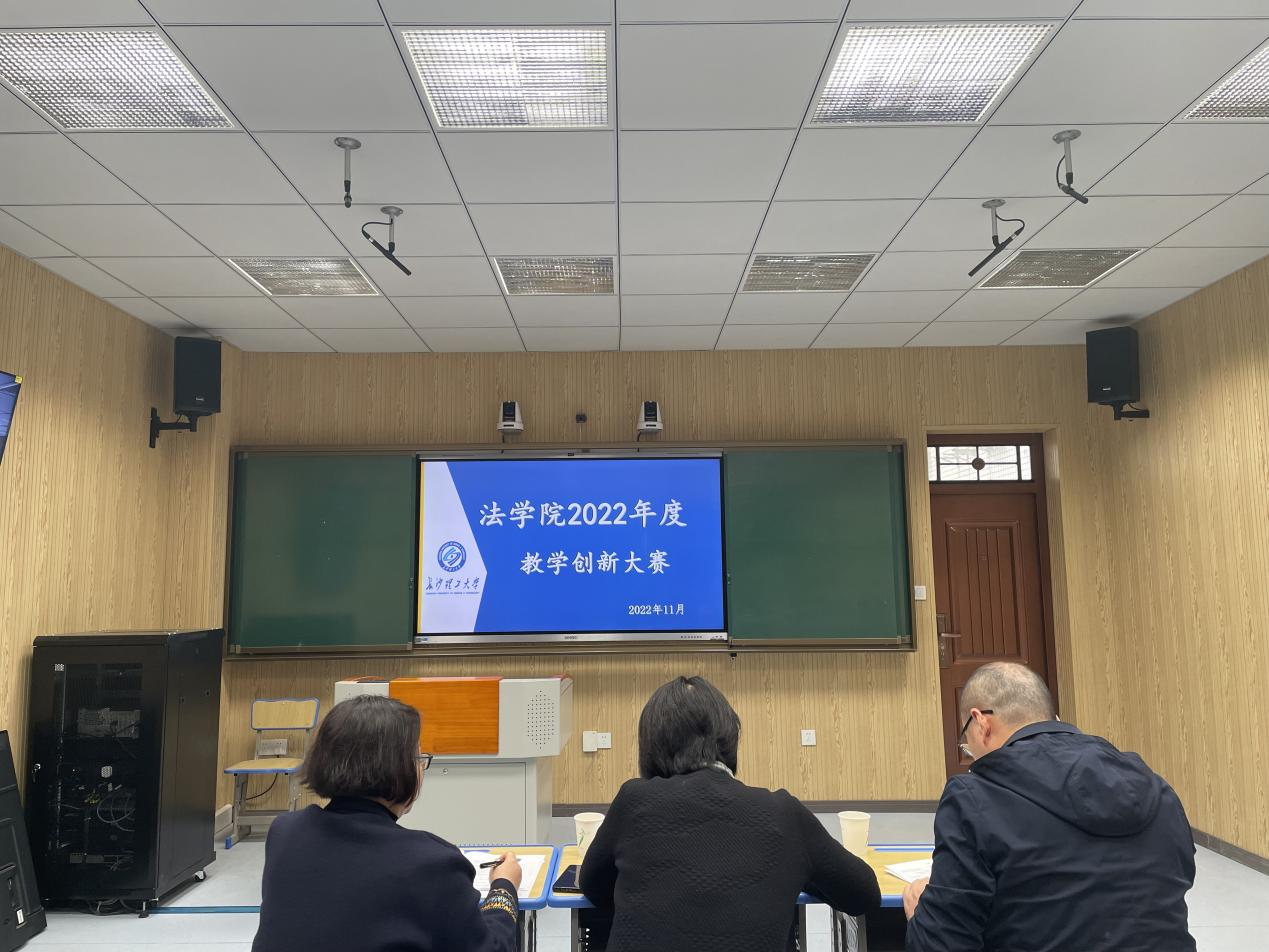 为全面落实立德树人根本任务,助力高校课程思政和新文科建设,促进信息技术与教育教学融合创新发展,引导我院教师潜心教书育人,不断提高人才培养质量,按照长沙理工大学《关于举办长沙理工大学第三届教学创新大赛的通知》文件要求,法学院于11月22日上午9点在金盆岭4-312智慧教室举办了2022年度法学院教学创新大赛。