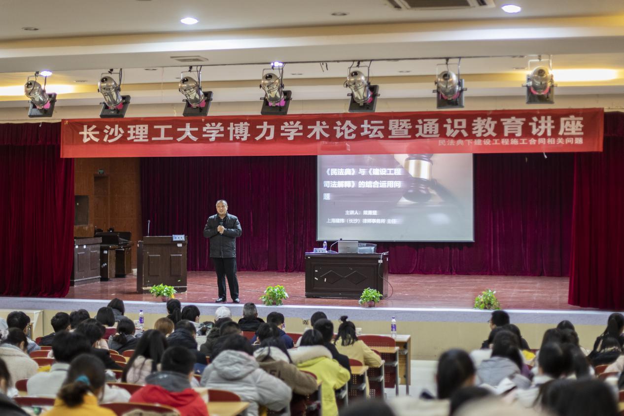 12月14日19:00,法学系于长沙理工大学云塘校区模拟法庭举办了以“民法典下建设工程施工合同相关问题”为题的学术讲座,本次讲座由上海建纬(长沙)律师事务所主任、长沙理工大学硕士生导师、湖南省工程法研究会副会长、湖南省律师协会副会长戴勇坚教授主讲,由长沙理工大学法学系副主任(主持工作)张敏纯主持。莅临本次讲座的有长沙理工大学法学学科带头人王新生教授以及法学系部分教师代表。