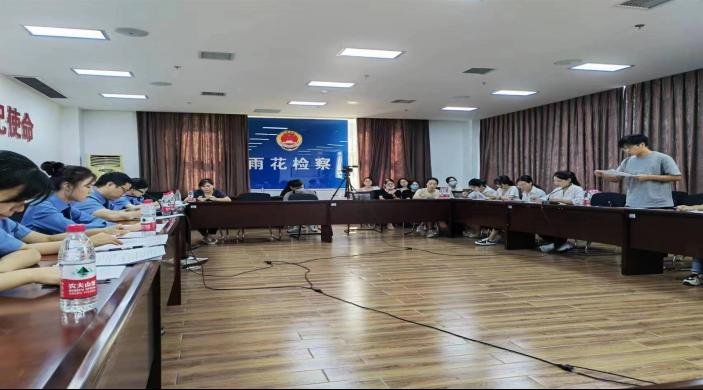 2023年4月22日,为加强校检合作基地建设,促进实践教学常态化,长沙理工大学法学院联合长沙市雨花区人民检察院举行“公诉人大赛模拟辩论”。湖南省人民检察院第二检察部主任梁驭骁,雨花区人民检察院党组成员、副检察长彭智勇,副检察长、第四检察部主任冯苹,长沙理工大学法学院带队老师刘文莉,雨花区检察院4位检察官及长沙理工大学法学院林琨、尹亮、黄哲恒、游倩4位选手参加本次模拟辩论。本次活动分为两个议程。第一个议程为“公诉案件法庭辩论”。第二个议程为专家点评及选手交流。