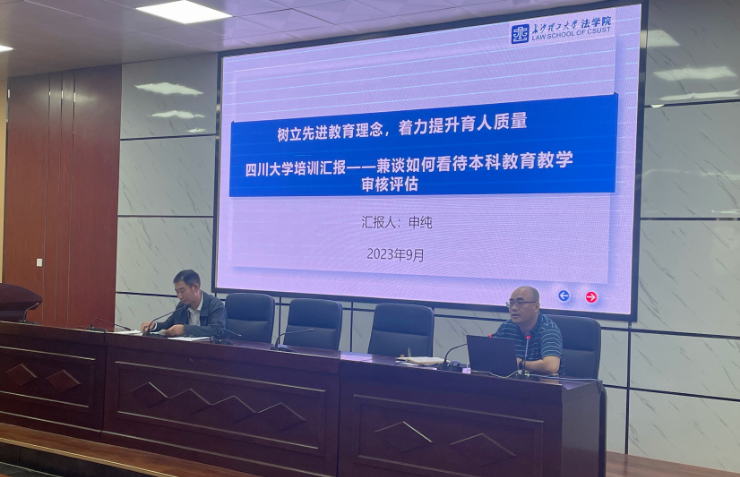 长沙理工大学教学管理与教学创新专题干部研修班于2023年7月10日在四川大学全国干部教育培训基地举行。我院院长张敏纯,副院长申纯全程参加此次培训学习。为将学习的收获传达到学院每位教师,以全新的姿态和昂扬的斗志开启新学期的各项工作,特举办此次学习心得分享会。申纯以《四川大学培训汇报——兼谈如何看待本科教育教学审核评估》为题,做专题汇报。