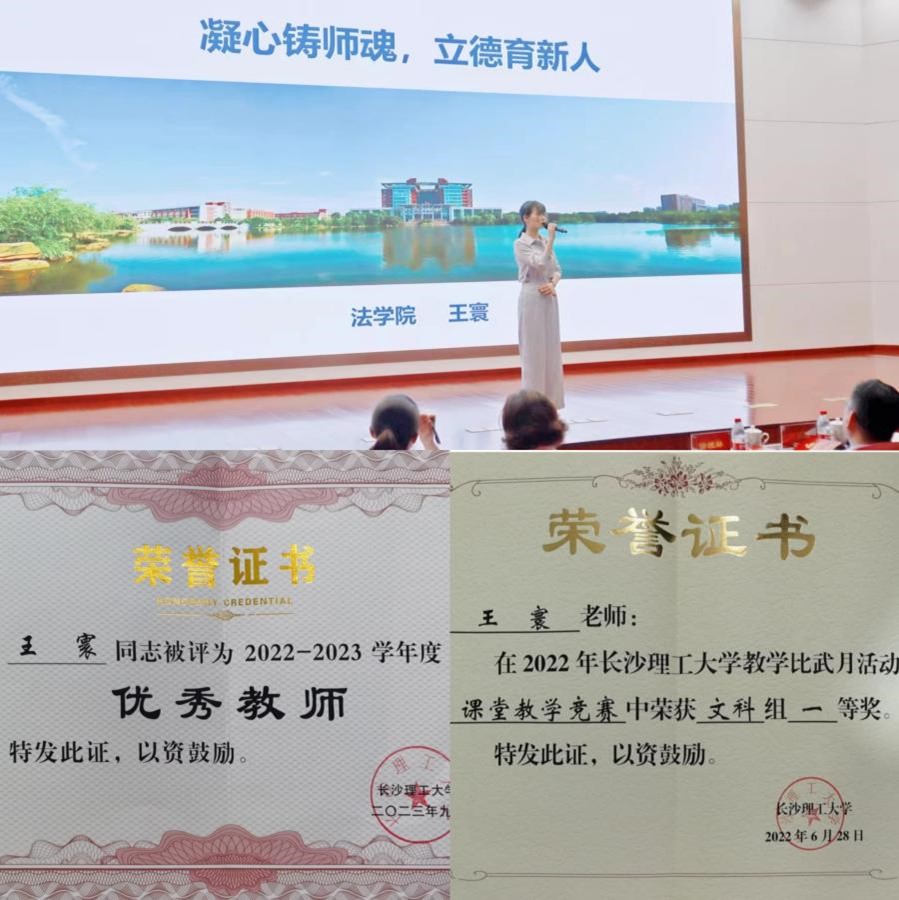 秉持着严于律己的教学态度,王寰老师在担任法学院专任教师以来,先后承担的所有课程评教均为“优秀”,2023年被评为长沙理工大学优秀教师。