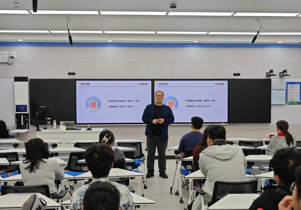 会议第一阶段,由人力资源和社会保障部国家级创业培训师、本源睿浦(北京)教育科技有限公司培训总监朱建炜老师做题为《评委视角的实战冲刺指南》的培训。朱建炜结合多年担任创新创业大赛国家级赛事评委的经验,从项目评审规则、路演技巧、商业计划书优化等维度展开讲解,针对大学生创业痛点提出解决方案。他指出赛事评审的核心在于创新性、可行性与社会价值的平衡,团队需避免陷入“技术自嗨”或“概念空泛”的误区。撰写商业计划书时需以“数据驱动叙事”为核心,通过精准的用户画像、市场规模量化及财务预测置信区间构建逻辑闭环。同时建议项目团队采用“注意力锚定-痛点共鸣-解决方案可视化”的三段式框架进行项目路演,提升表达效率。