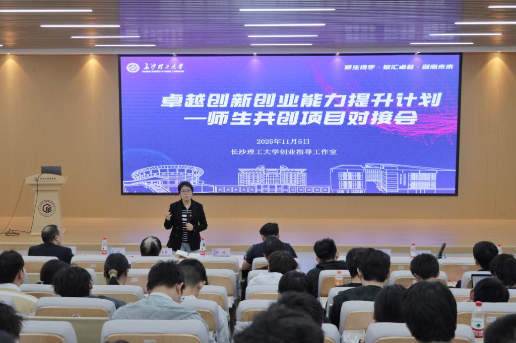 2025年11月5日下午,卓越工程师学院在新工训大楼515报告厅举办了“卓越创新创业能力提升计划——师生共创项目对接会”。会议特邀全国万名优秀创新创业导师代表游勇、湖南云顶之翼科技有限公司总经理李竣西子、岳麓山国家大学科技园成果转化部部长卢佼担任指导嘉宾。学院院长韩艳、党委书记杨晨、副院长杨现锋、交叉创新研究中心教授刘志强等领导与教师代表共同出席。会议由交叉创新研究中心主任王力东主持。