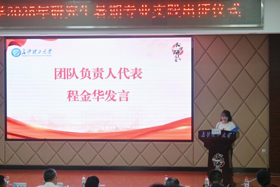 我院2023级硕士研究生程金华代表实践团队负责人发言,她表示作为电气工程专业的研究生,团队将深入湖南各地市供电公司,结合湖南红色文化中的电力精神,调研并总结如2008年抗击特大冰灾、2024年抗冰保电等重大保电战役中的先进事迹。她承诺团队将坚持知行合一,扎根基层,在实践中增长知识才干,锤炼意志品质,推动科研成果转化,以专业所长服务社会发展,并严守安全规范,展现长理电气人的专业素养。