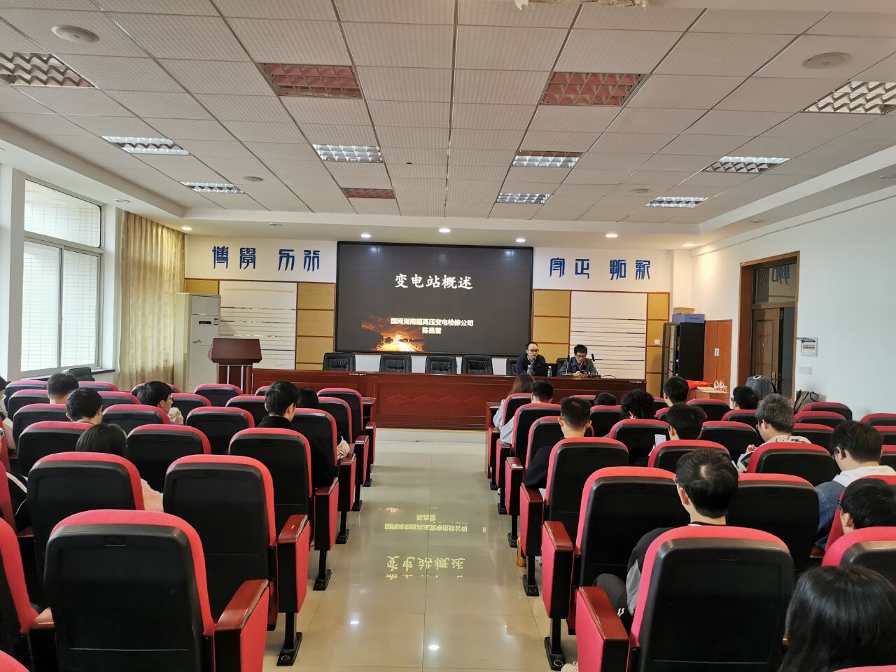 陈昌雷向师生们系统介绍大型智慧变电站在电网中的作用,介绍变电站内一次设备、保护及自动装置、辅助设备配置情况,讲述设备作用及相互联系,简述维护重点。