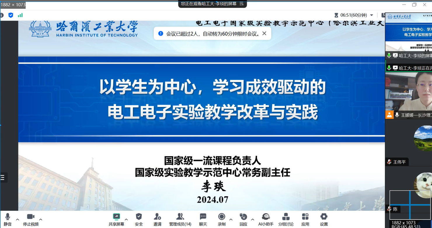 7 月 12 日,在电气学院副院长王媛媛的主持下,一场别开生面的学术报告通过腾讯会议举行。哈尔滨工业大学电工电子国家级实验教学示范中心常务副主任李琰教授应邀为我院教师作“以学生为中心,学习成效驱动的电工电子实验教学改革与实践”专题报告。湖南理工学院信息科学与工程学院院长童耀南带领其学院教师共同参加。