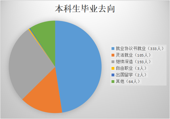3.去向分布:细分为签就业协议、继续深造、灵活就业、出国留学、自由职业、其它(包括待就业或无就业意愿和拟深造)六个指标进行图标分析,具体情况如下图所示: