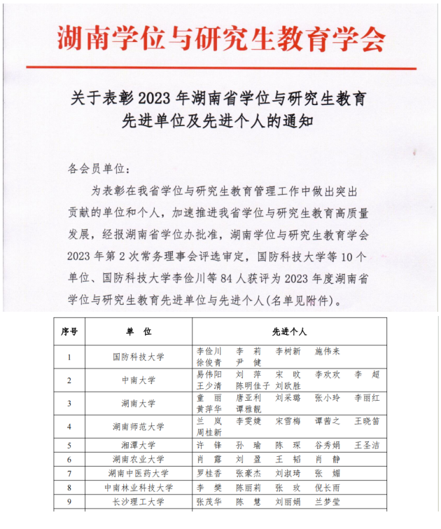 经学院和学校推荐,湖南学位与研究生教育学会评审,我院王媛媛教授荣获湖南省第三届“优秀研究生导师”称号,兰梦莹老师获湖南省学位与研究生教育“先进个人”称号。