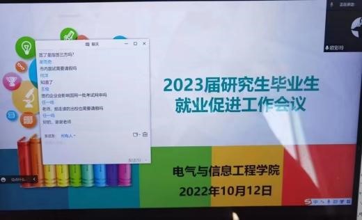 为帮助研究生了解当前就业形势,促进研究生顺利就业,20221012日下午,电气学院召开了线上2023届研究生毕业生就业促进工作会议,欧彩玲老师主讲,2023届全体研究生参会。