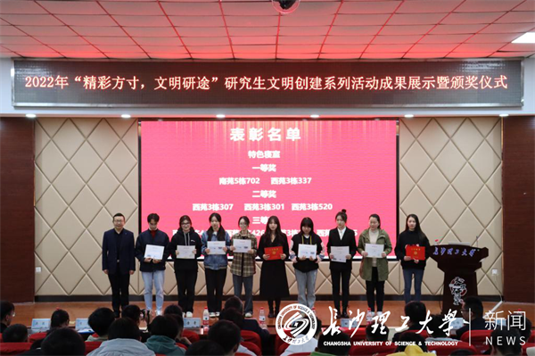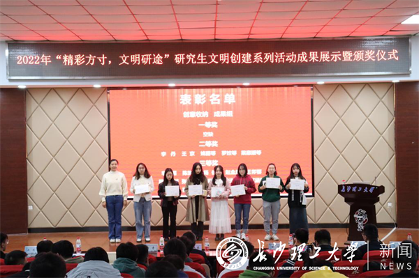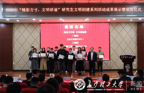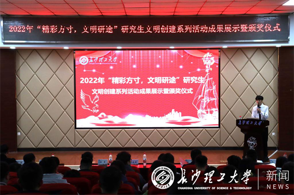 为深入学习贯彻党的二十大精神,推进学校精神文明建设,展示研究生文明创建系列活动成果,11月16日下午,“精彩方寸,文明沿途”长沙理工大学首届研究生文明创建系列活动成果展示暨颁奖仪式在云塘校区研究生学术报告厅举行。副校长胡永乐出席活动并致辞。研究生院(研工部)和各学院负责人、辅导员代表及200余名研究生参加。