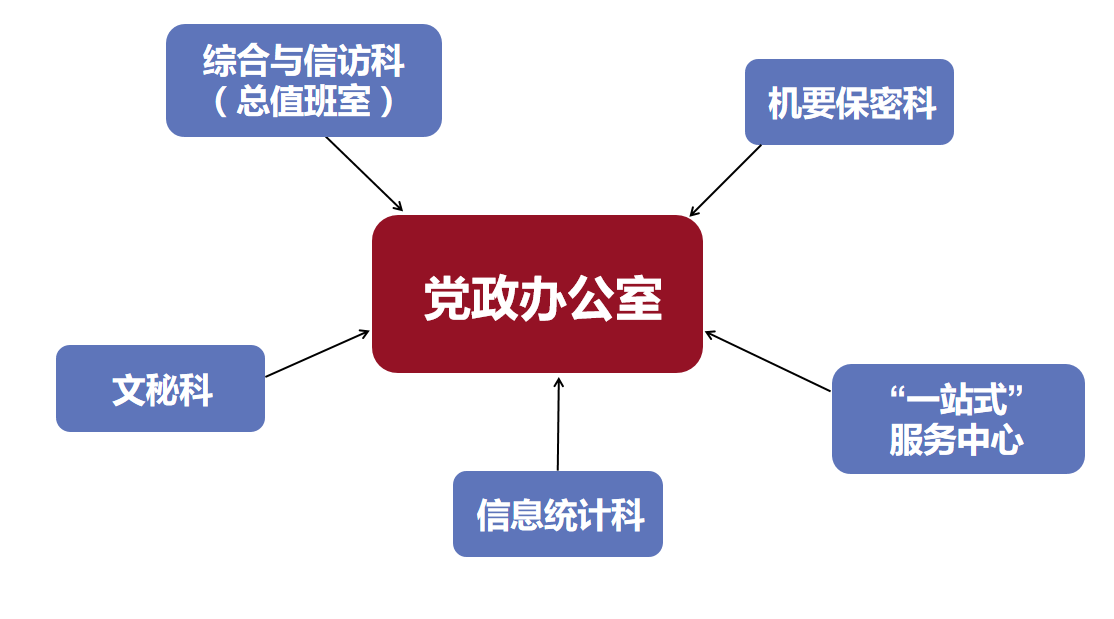 党政办现设有综合与信访科(总值班室)、文秘科、信息统计科、机要保密科,“一站式”服务中心。