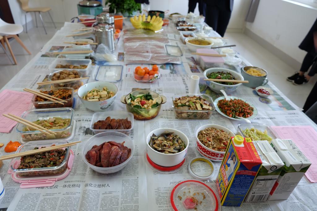 本次活动分为三个环节,一是学院工会送祝福。刘安生代表学院感谢陈瑜多年以来的辛勤付出并祝愿其在新的工作岗位上一切顺利,再创佳绩,同时代表学院欢迎吴迪龙来院工作。二是“学史明理”四史学习分享。学院教职工入党积极分子王璐分享了毛主席一生酷爱红烧肉,但在三年困难时期一口肉也不愿意吃的故事,故事分享让大家感受到了毛主席的为民情怀,本次分享学习互动旨在引领全体教职工从党史学习中汲取前进的智慧和力量。三是中华美食分享。学院教职工精心准备了红烧肉、啤酒鸭、清明粑等不同类别30余道中华传统美食其分享,菜品美味可口,活动现场气氛活跃、其乐融融。