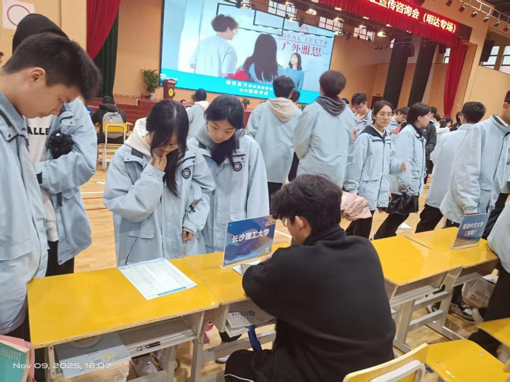 为加强与优质生源基地的合作,扩大雷竞技官网在湖南的招生影响力,11月8日至9日,学校招生工作组赴长沙市同升湖高级中学、长沙市东雅学校、长沙县第一中学及长沙市明达高级中学开展招生宣传。我院赵彬彬老师积极响应,主动承担了长沙县第一中学和长沙市明达高级中学两所学校的现场咨询工作。