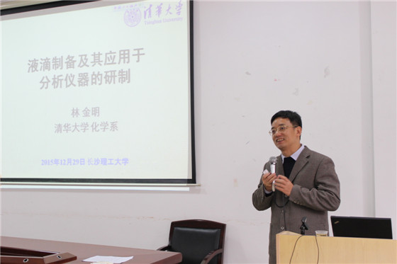 12月29日下午,应化学与生物工程学院邀请,国家杰出青年科学基金获得者、教育部“长江学者”特聘教授、清华大学化学系林金明教授来雷竞技官网讲学,在云塘校区工科三号楼A-320作了题为《液滴制备及其应用于分析仪器的研制》的学术报告。学术报告会由院长杨荣华教授主持,副院长曹忠教授、朱志平教授,以及化学与食品相关学科的教师和研究生、应用化学专业本科生100余人聆听了林教授的精彩报告。