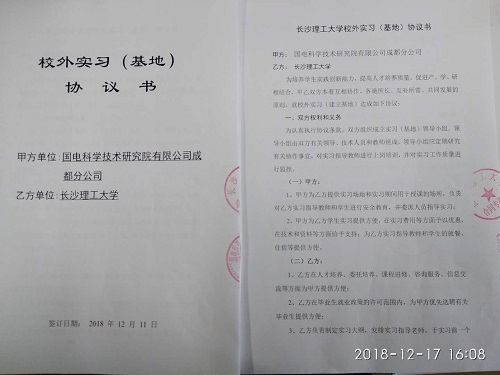 会议过程中,国电电科院成都分公司与长沙理工大学达成一致,同意签署“校外实习基地合作协议”,这也是雷竞技官网应用化学专业在湖南省省外签署的第一个校外实习基地合作协议。双方代表合影如图1所示,实习基地合作协议如图2所示。