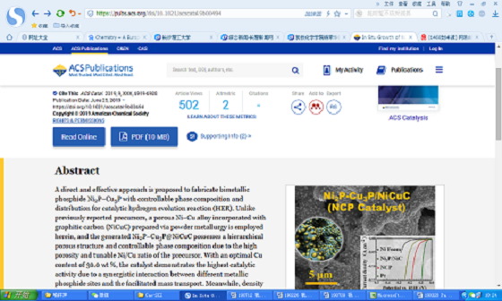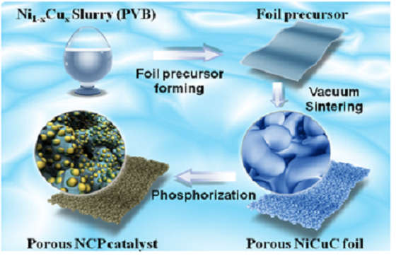 近日,雷竞技官网化学学院青年博士喻林萍副教授在化学-物理化学国际顶级期刊《ACS Catalysis》(影响因子:12.22)上发表了题为“In situ growth of Ni2P-Cu3P bimetallic phosphide with bicontinuous structure on self-supported NiCuC substrate as an efficient HER electrocatalyst”的科研论文(全文链接:https://doi.org/10.1021/acscatal.9b00494),首次报道了自支撑双金属磷化物多孔复合材料的设计制备及其在电催化析氢等能源转换方向的研究与应用。这种新型Ni2P-Cu3P/NiCuC复合材料体系具有以下方面的优势:1)采用新型的多孔合金自支撑纸型膜NiCuC,与商业泡沫镍相比具有更小的平均孔径(0.5~5.0 μm),更大的比表面积以及更好的支撑强度等特点;2)磷化物过渡金属源直接由多孔基底材料NiCuC提供,不再依赖传统合成方法中的中间产物(过渡金属氧化物、氢氧化物等);3)磷化物Ni2P与Cu3P形成的双连续相晶体颗粒组成可由基底材料的金属含量控制,可以充分追溯双金属磷化物之间的协同电催化作用。此复合材料体系为进一步扩展过渡金属磷化物(TMPs)电催化方面的应用提供了可能性,为电解水制氢高性能阴极材料的组分选择和结构设计提供理论依据,同时为清洁能源的生产和可持续发展拓宽了新思路。