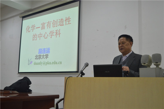 12月8日,中国化学奥林匹克委员会总教练、国家级教学名师、北京大学著名专家、学者段连运教授应邀来到长沙理工大学化学与生物工程学院进行学术交流访问。
