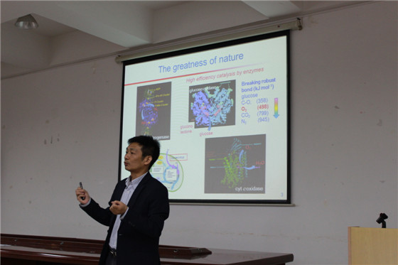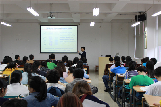 随后,夏教授在工三-A320开展了主题为“基于纳米材料催化特性的电化学分析”的学术报告。夏教授主要从四个方面详细阐述了自己的研究工作,首先从生命体与电化学的密切关联引出他课题组的主要研究方向—石墨烯的电化学特性;接着,幽默生动地讲述了氮掺杂石墨烯的发现及发展;然后,详细、具体地讲解氮掺杂石墨烯/金属复合物的原理及相关实验佐证;最后,探讨了等离子体催化电化学反应,通过一系列的实验及相关研究得出了一些重要的学术成果。