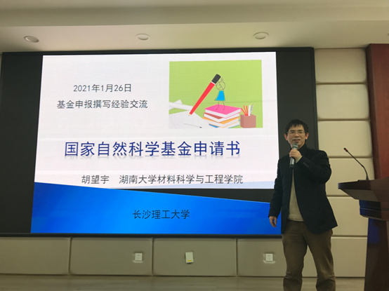 为了帮助教师更好地准备2021年度国家自然科学基金申报工作,提高申报质量,推动学科专业和教师个人科研发展。2021年1月26日上午,应长沙理工大学化学与食品工程学院的邀请,湖南大学材料科学与工程学院、博士生导师胡望宇教授一行来到化学学院访问,首先座谈交流了国家基金发展动态,随后在工三-A320会议室作了“国家基金申报策略”专题讲座。讲座由化学学院副院长曹忠教授主持,院党委书记程云辉教授、副院长朱志平教授,以及各学科相关教授、博士50余人参加。