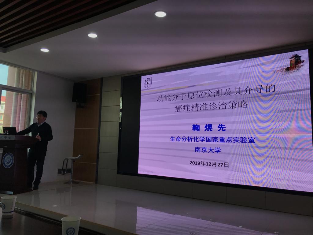 报告会上,鞠熀先教授从新型生物传感的方法构建的十大战略出发,阐述细胞功能分子原位检测及精准诊疗应用的重要性。系统介绍了团队在纳米材料的生物功能化,信号开关与信号放大策略的设计,细胞表面糖基、细胞内糖基转移酶、MicroRNA/mRNA、端粒酶的原位检测,光动力治疗与基因治疗及疗效监测新技术等方面的工作。鞠教授渊博的学识、前沿的思维、深入浅出的讲解和风趣幽默的语言不时赢得全场师生的阵阵掌声和欢快笑声。