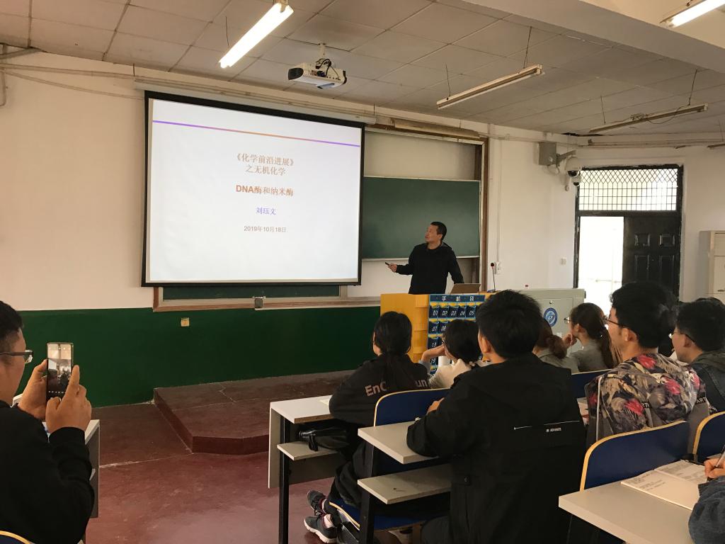201910188:00—11:40,在金盆岭校区十四教学楼4002教室,加拿大滑铁卢大学博士生导师刘珏文教授为化学与食品工程学院2019级化学、应化、化工专业研究生讲授《化学化工学科前沿》课程,授课内容为《化学前沿之生物无机化学—DNA酶和纳米酶》。