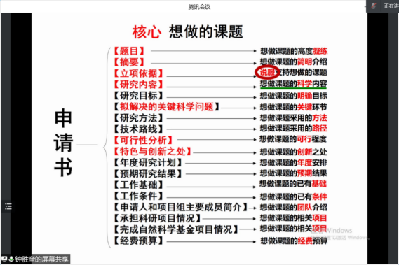 会议中,钟教授教授结合自己多年的项目申请和评审经验,对国家自然基金项目申报如何选好题、摘要和立项依据如何切入、研究内容如何设计以及如何提高申报标书质量等方面谈了自己的心得体会,并且针对国家自然科学基金申请书撰写过程中的容易出现的误区、申请书各部分内容的重要性和关键环节上应当注意的细节部分进行了深刻的论述。