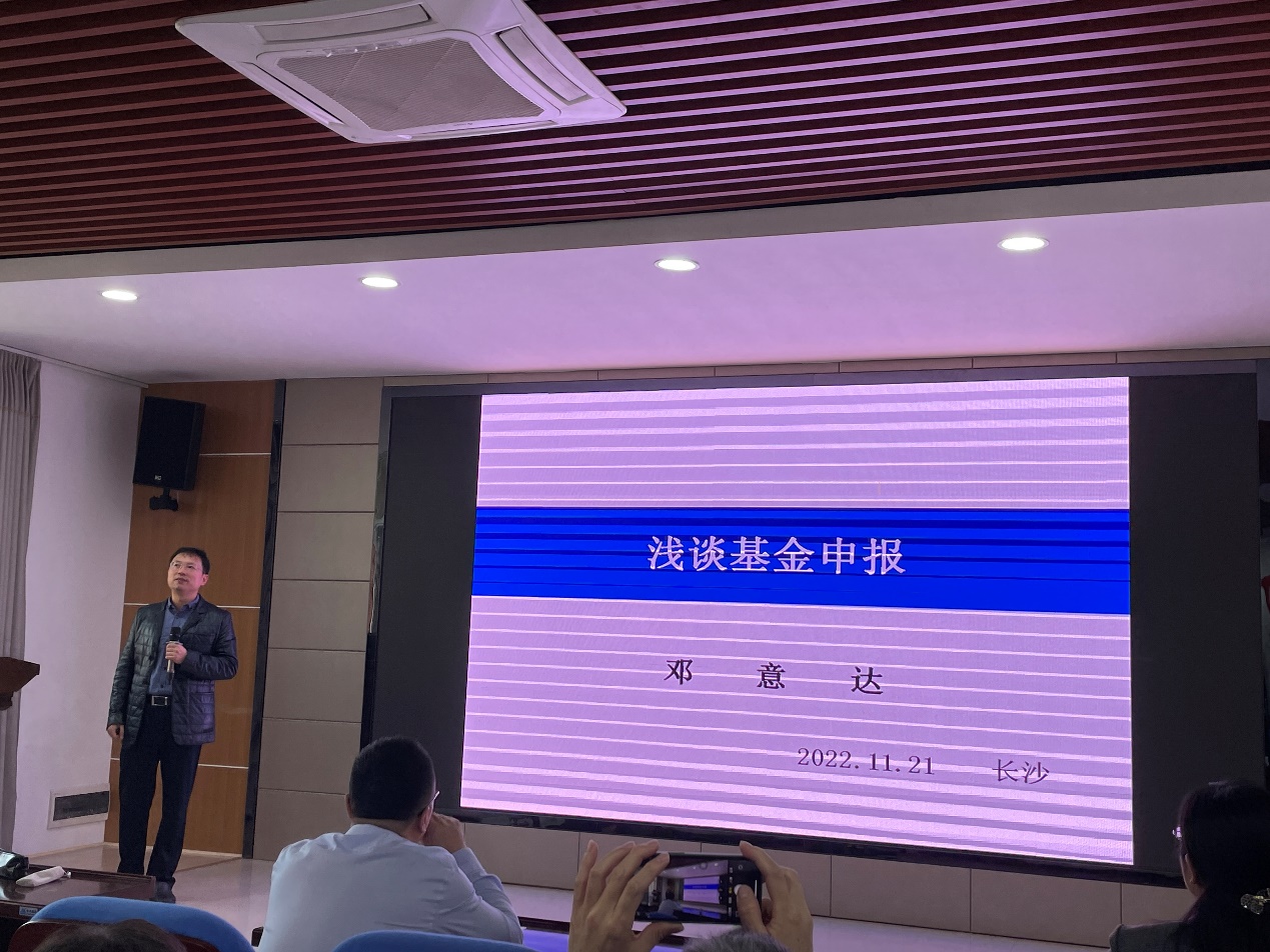 为了帮助我院教师更好地准备2023年度国家自然科学基金项目申报,提高项目申报质量,推动学院学科建设和教师科研能力发展。2022年11月21日上午,应长沙理工大学化学化工学院邀请,国家重大人才工程特聘教授海南大学邓意达教授在长沙理工大学云塘校区新能源大楼3B栋301报告厅作了题为“浅谈基金申报”的专题讲座。讲座由化学化工学院副院长(主持工作)张跃飞主持,院党委书记宋刘斌、副院长喻林萍、副院长陈启杰,以及各学科相关教授、博士参加。