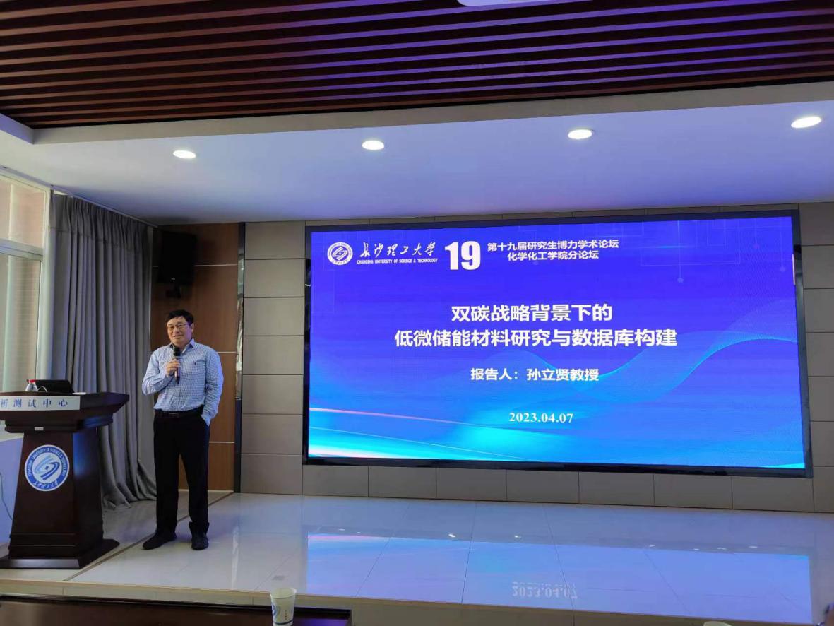 2023年4月7日上午,应长沙理工大学化学化工学院邀请,桂林电子科技大学博士生导师孙立贤教授来雷竞技官网进行学术交流访问,在云塘校区新能源大楼3B栋301报告厅作了题为“双碳战略背景下的低微储能材料研究与数据库构建”的学术报告。学术报告会由化学化工学院副院长卿志和教授主持,陈启杰副院长、喻林萍副院长、曹忠教授、朱志平教授及部分老师和研究生100余人参加了本次讲座。