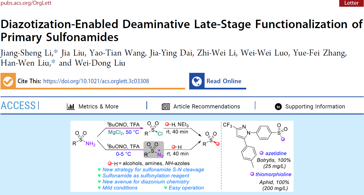 2023年11月10日,我院李江胜教授团队的最新研究成果“Diazotization-Enabled Deaminative Late-Stage Functionalization of Primary Sulfonamides”在有机化学著名期刊Organic Letters上在线发表。Organic Letters由美国化学会(ACS)出版,是有机化学领域的权威期刊,属于中科院一区Top期刊,也是Nature Index收录期刊。