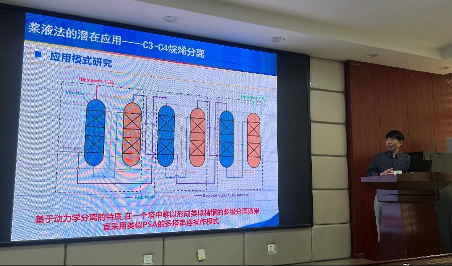 陈光进教授从MOF材料用于气体分离面临的挑战出发,提出了多孔浆液法——吸收吸附耦合分离技术,详细介绍了液膜分离技术的原理、特点、优势以及应用前景,并阐述了液膜分离技术在脱碳、CH4/H2、CH4/N2、C2H6等体系的潜在应用及预期能耗。报告结束后,陈光进教授与师生开展了热烈的讨论,陈教授鞭辟入里地回答了老师们的问题,现场气氛活跃。陈光进教授的学术讲座不仅拓宽了师生们的研究视野,也对雷竞技官网化工、化学、材料科学等相关领域的学术研究与发展起了积极的推动作用。