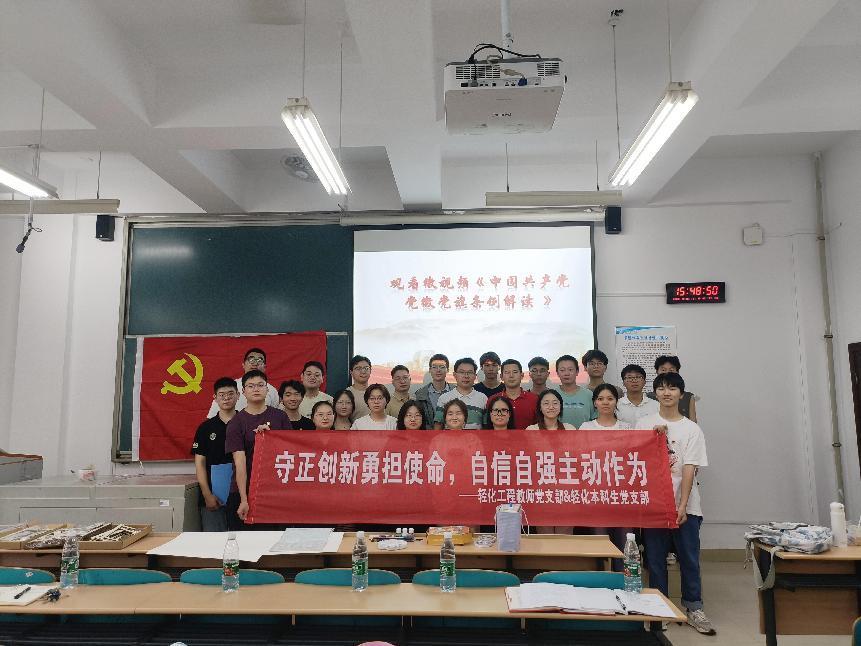 轻化工程教师党支部和轻化本科生党支部联合开展的主题党日活动,认真学习了习近平新时代中国特色社会主义思想和《中国共产党党徽党旗条例》,并通过实践活动感受专业特色和节日情怀,努力践行新时代新征程上每个人的使命与担当。