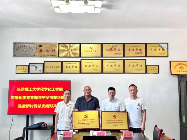 上午,化学化工学院应用化学党支部一行来到宁乡市菁华铺乡陈家桥村,该村是湖南省第二批全国乡村治理示范村之一。首先,在村党总支副书记付素清带领下参观了陈家桥村近年的建设成果。随后,在陈家桥村会议室举行了座谈。陈家桥村党总支书记黄立平首先介绍了陈家桥村在“党建引领、五促共治”发展模式下的蝶变过程,包括美丽屋场建设、油菜田地发展、百亩果园规划、厨余垃圾和生活污水处理设施建设等方面的成果;李家春对陈家桥村近年来在乡村振兴方面取得的显著成效表示钦佩,也相应介绍了化学化工学院在党建工作、人才培养等方面的基本情况;最后,中共长沙理工大学化学化工学院委员会与中共宁乡市菁华铺乡陈家桥村总支部委员会达成“结对共建基层党组织”的合作协议。在授牌仪式上,双方党组织负责人就下一步的合作计划进行了深入交流。双方一致同意,将定期开展联合党日活动,交流党建工作经验;同时,将依托学院的专业优势,为陈家桥村提供科技支持和智力支撑,共同推动乡村振兴和学院高质量发展。