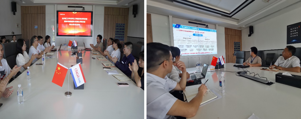 参观完后,应用化学党支部一行与湖南中伟新能源科技有限公司青年党支部在中伟研究院会议室就校企联合党建进行了座谈交流,中伟公司副总经理、工会主席兼低碳党支部书记黎波、青年支部书记黄娟及青年支部各支委、技术部门骨干邹炳民等共同出席了座谈会。双方就科教融合、人才培养、技术创新等议题展开了深入交流与探讨。喻林萍首先介绍了化学化工学院的发展历程、学科方向及应用化学专业的人才培养特色。双方围绕“科教融合,共促发展”的主题,开展了热烈讨论。应用化学专业的教师们介绍了自己的最新研究成果和技术应用情况,并了解了新能源企业对人才培养的需求;中伟公司青年支部的技术骨干则分享了企业在技术创新和产品研发方面的实践经验。双方还就如何加强产学研合作、促进科技成果转化等议题进行了探讨。黎波副总经理肯定了长沙理工大学化学化工学院在科研与教学方面取得的成就,并表示中伟公司研究院愿意与化学化工学院建立长期稳定的合作关系,共同探索科教融合新模式,为公司产业创新与发展注入新的活力。会谈结束前,李家春还会见了在中伟公司就职的长沙理工大学优秀校友代表邹炳民等。
