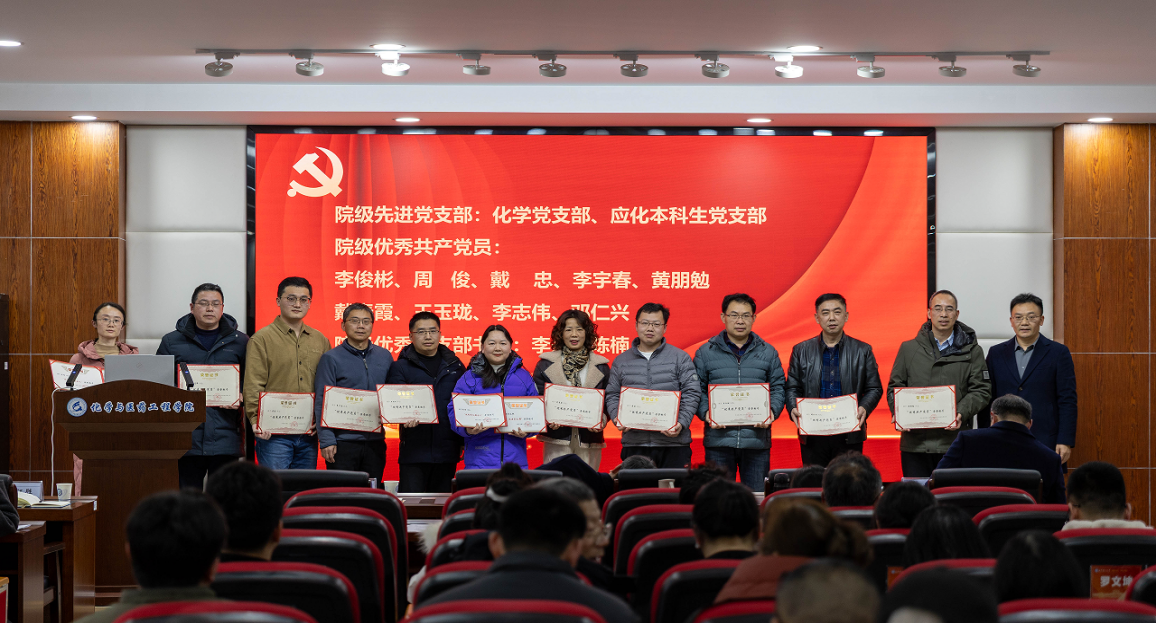 会议对2024-2025年度党建工作先进集体和先进个人进行了表彰。实验中心党支部获评校级“党建工作样板支部”,应用化学党支部获评“校级先进党支部”。李志伟同志获评“校级双带头人教师党支部书记标兵”,刘瀚文、谌委菊同志获评“校级优秀共产党员”,罗文坤同志获评“青年教工党员示范岗”。