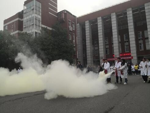 随后,在工科三号楼前坪进行了火灾事故应急处理演练。保卫处易国安老师讲解了干粉灭火器的使用方法。多名学生及老师亲自体验灭火器使用,对模拟火灾现场进行了扑灭处理。