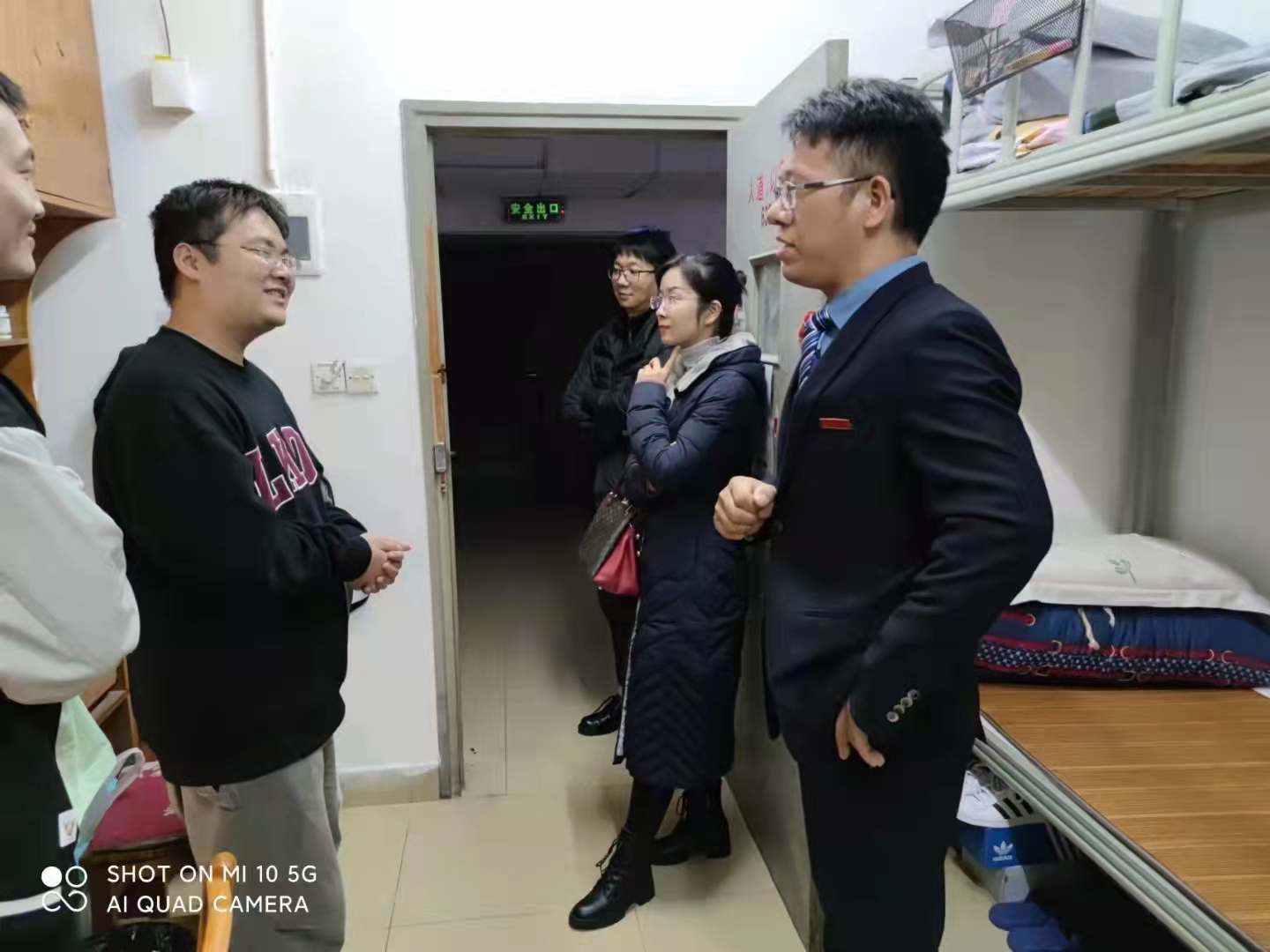 宋刘斌、陶双、张跃飞和张航来到金盆岭校区西苑4栋学生公寓,看望21级的本科男生。立冬之日,气温骤降,天气寒冷,领导们细心询问同学们是否准备好了棉衣棉被,并再三叮嘱同学们一定要做好防寒保暖,谨防发烧感冒。对于来自外省的同学,院领导们仔细地了解情况,关心他们来湖南后生活适不适应、饮食是否能接受,并亲切的告诉大家不要想家,这里就是大家的第二个家。同学们的宿舍干净整洁,充分体现出当代大学生的精神风貌,获得了领导们的一致点赞。