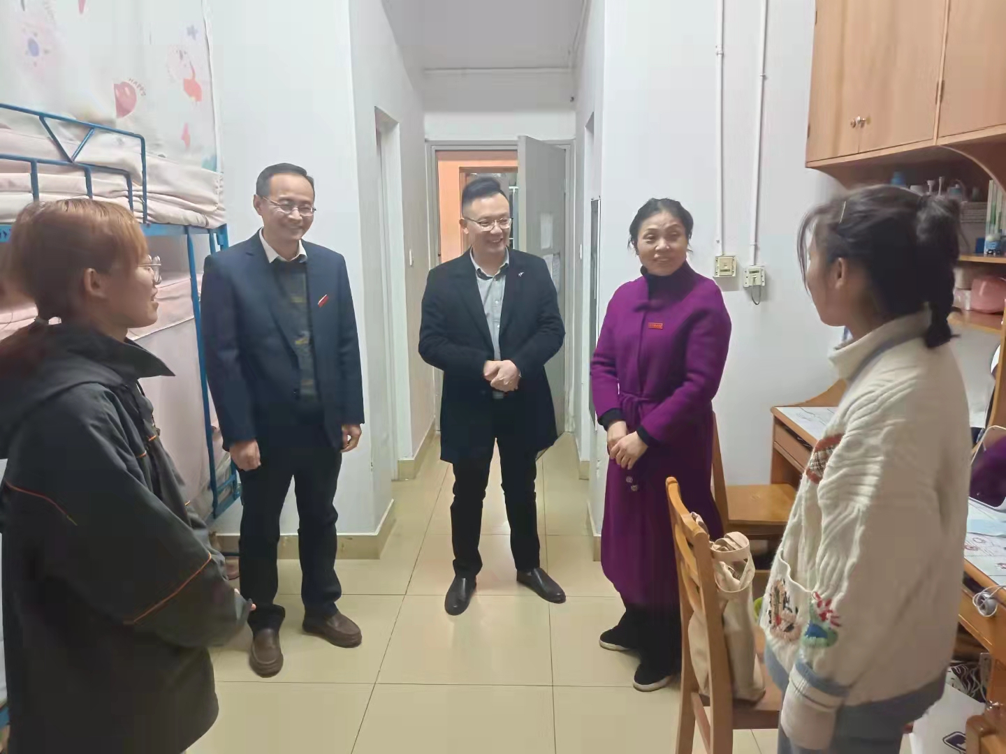 陈启杰、李江胜、张玲以及王彪走访了西苑10栋的本科女生宿舍,与同学们进行交谈。他们详细了解学生在日常学习中存在的问题,关心他们的学习生活适应问题,并听取学生对于学院相关工作的建议。