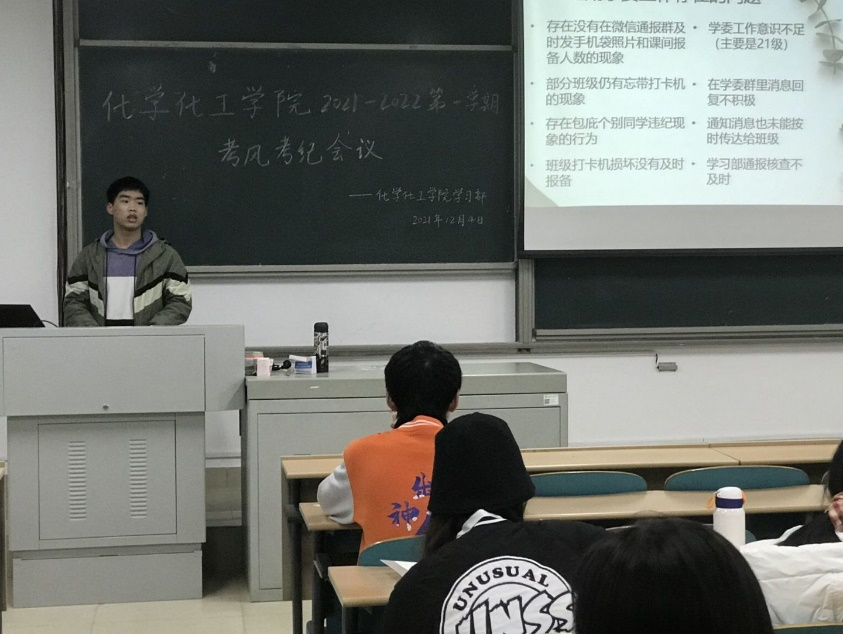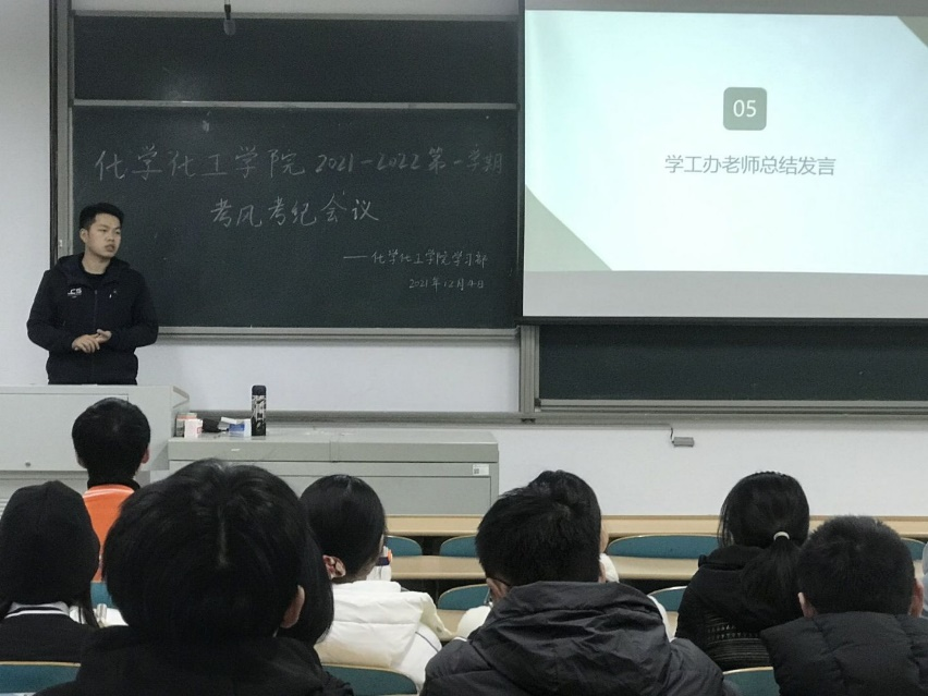 2021年12月4日晚,化学化工学院考风考纪主题教育大会于工三A207举行。本次会议旨在严肃考风考纪,加强学生教育,采取线上线下同时进行的方式举行。学工办王彪老师及化学化工学院各班学习委员与班长出席本次会议。