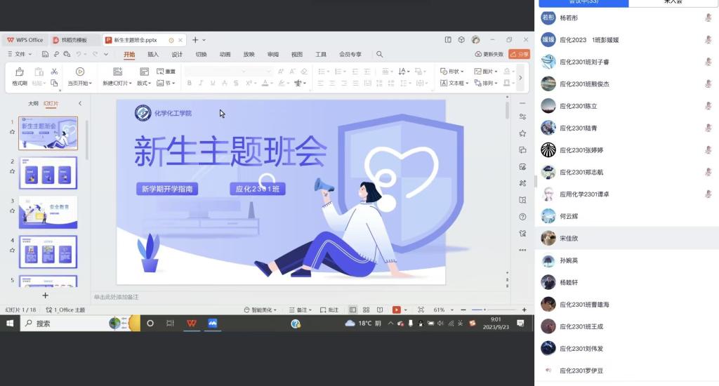 9月23日上午,化学化工学院2023级本科新生各班级分会场在线上召开第一次主题班会,会议由新生班主任和下班党员主持召开,全体新生参会。