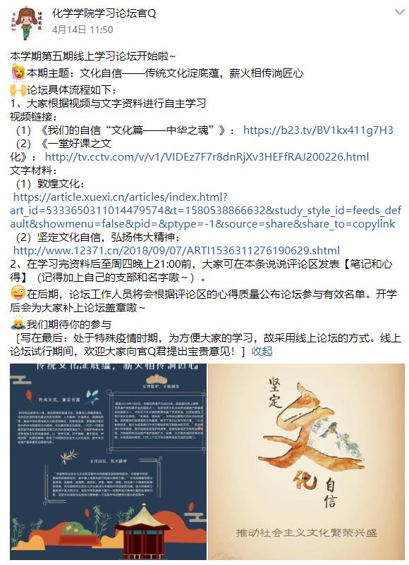 4月14日至4月17,化学学院学生党总支举办第五期线上学习论坛。本期主题为“文化自信——传统文化淀底蕴,薪火相传淌匠心”,共有来自九个支部的176名同志参加。