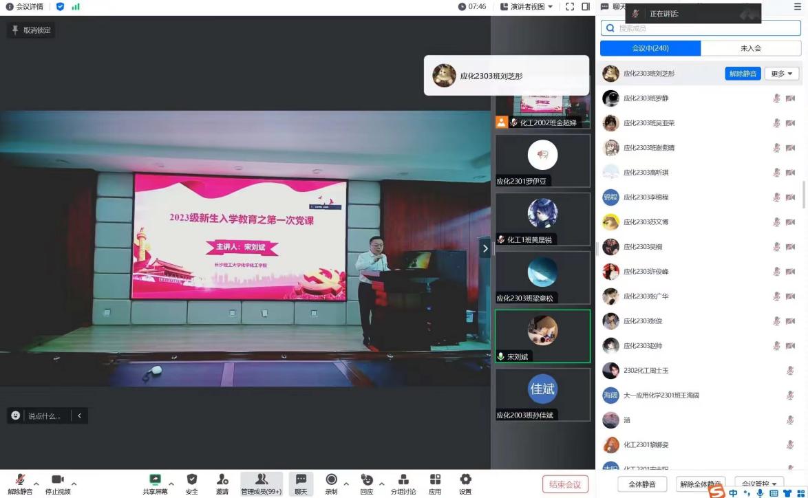为帮助新生坚定理想信念,明确人生目标。9月22日下午,化学化工学院举行2023级本科新生入学教育之书记的第一次党课。此次党课采用线上腾讯会议的形式,由学院党委书记宋刘斌主讲,2023级本科新生辅导员陈楠和全体本科新生线上参会。