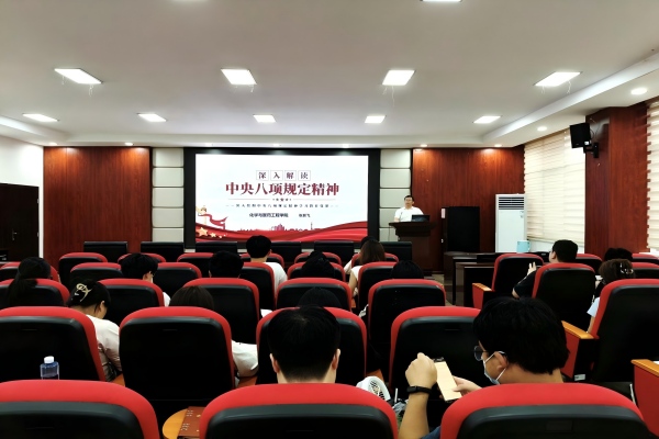 为深入贯彻落实党的二十届三中全会精神,推动全面从严治党向纵深发展,进一步强化学生党员纪律意识与作风建设,5月20日下午,化学与医药工程学院学生党总支在工科三号楼A320会议室组织开展中央八项规定精神专题学习。学院院长张跃飞担任主讲,全体学生党员参与学习。